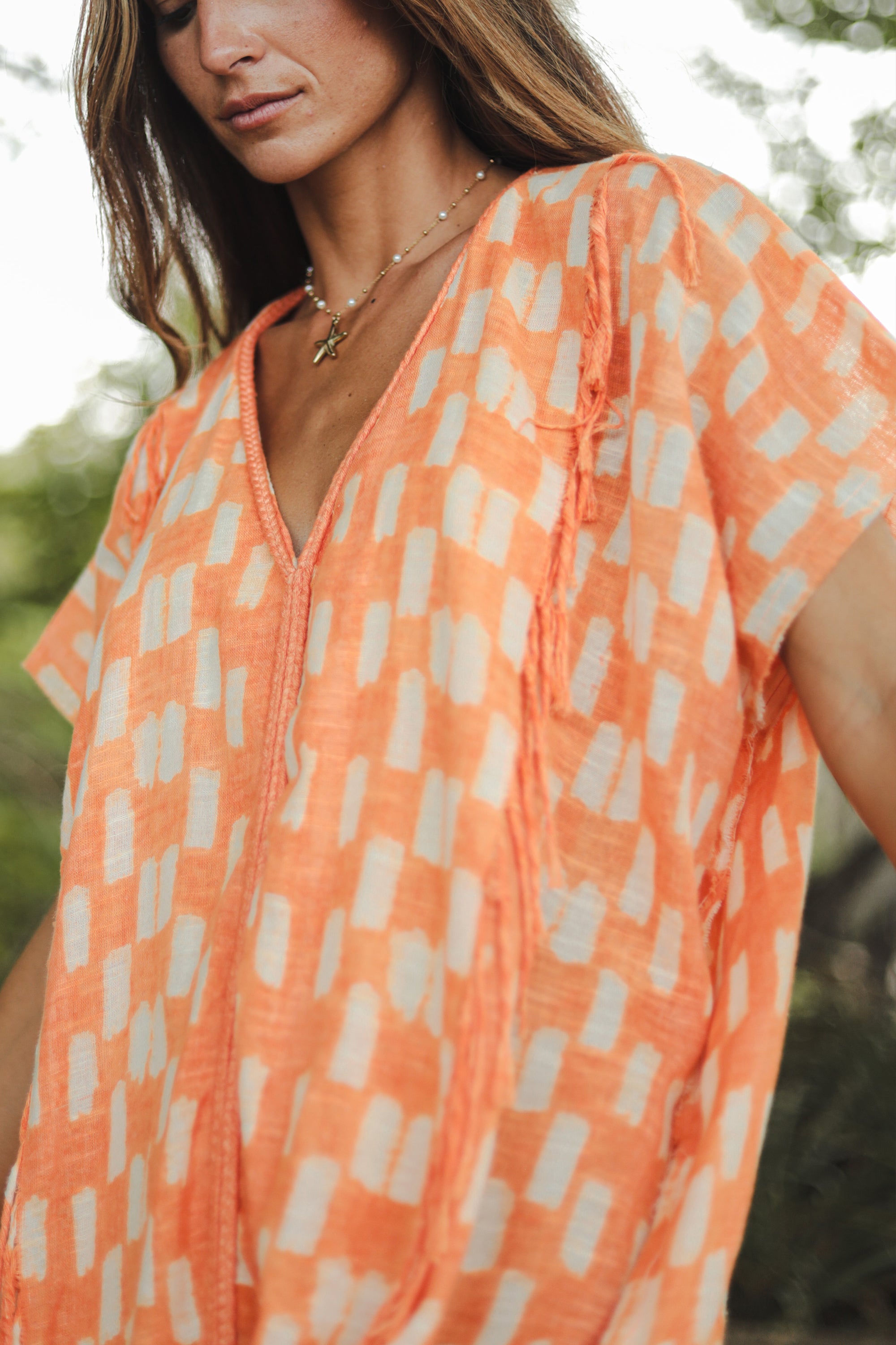 A breezy beach layer in a vibrant orange and ivory print, featuring raw-edge fringe details, soft V-neckline, and a relaxed fit. Light, effortless, and full of movement—your sunny day essential.