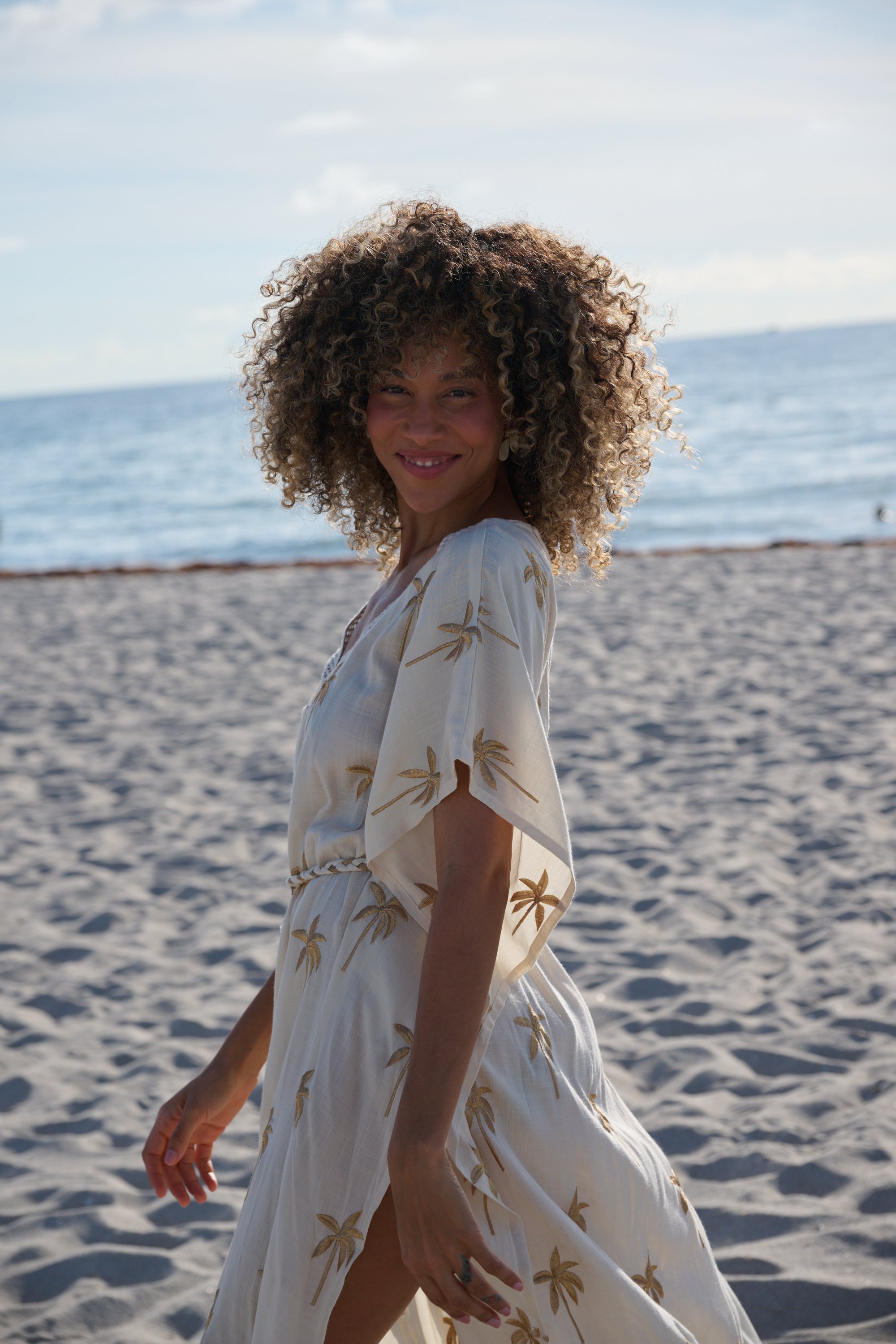 Breezy and sun-kissed, the Goldie Kaftan features golden palm embroidery, a relaxed drape, and a braided waist tie for effortless shape. The ultimate beach-to-brunch layer.