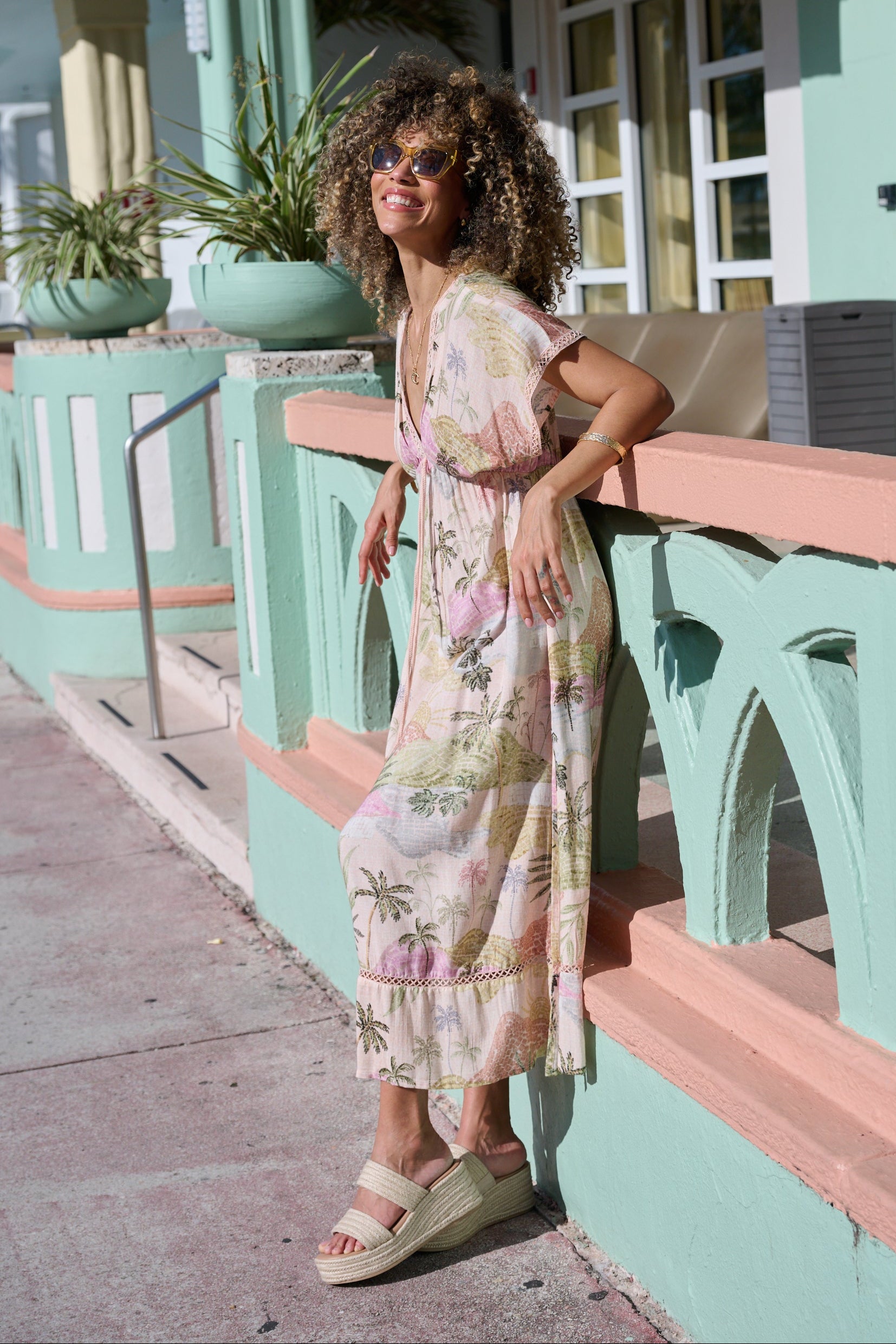 The Oasis Maxi Dress brings effortless island energy with its dreamy pastel palette and palm-scape print. Designed with a relaxed silhouette, lace-trim accents, and an adjustable tie waist, it floats beautifully from beach strolls to sunset cocktails. A soft, breezy statement for your next tropical escape.