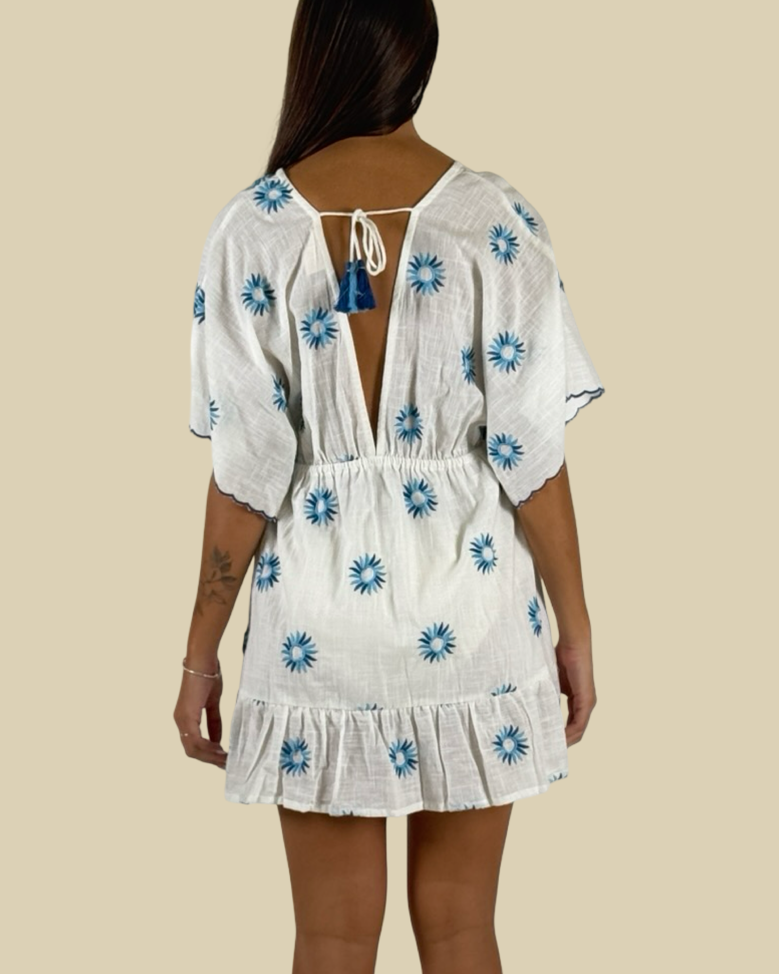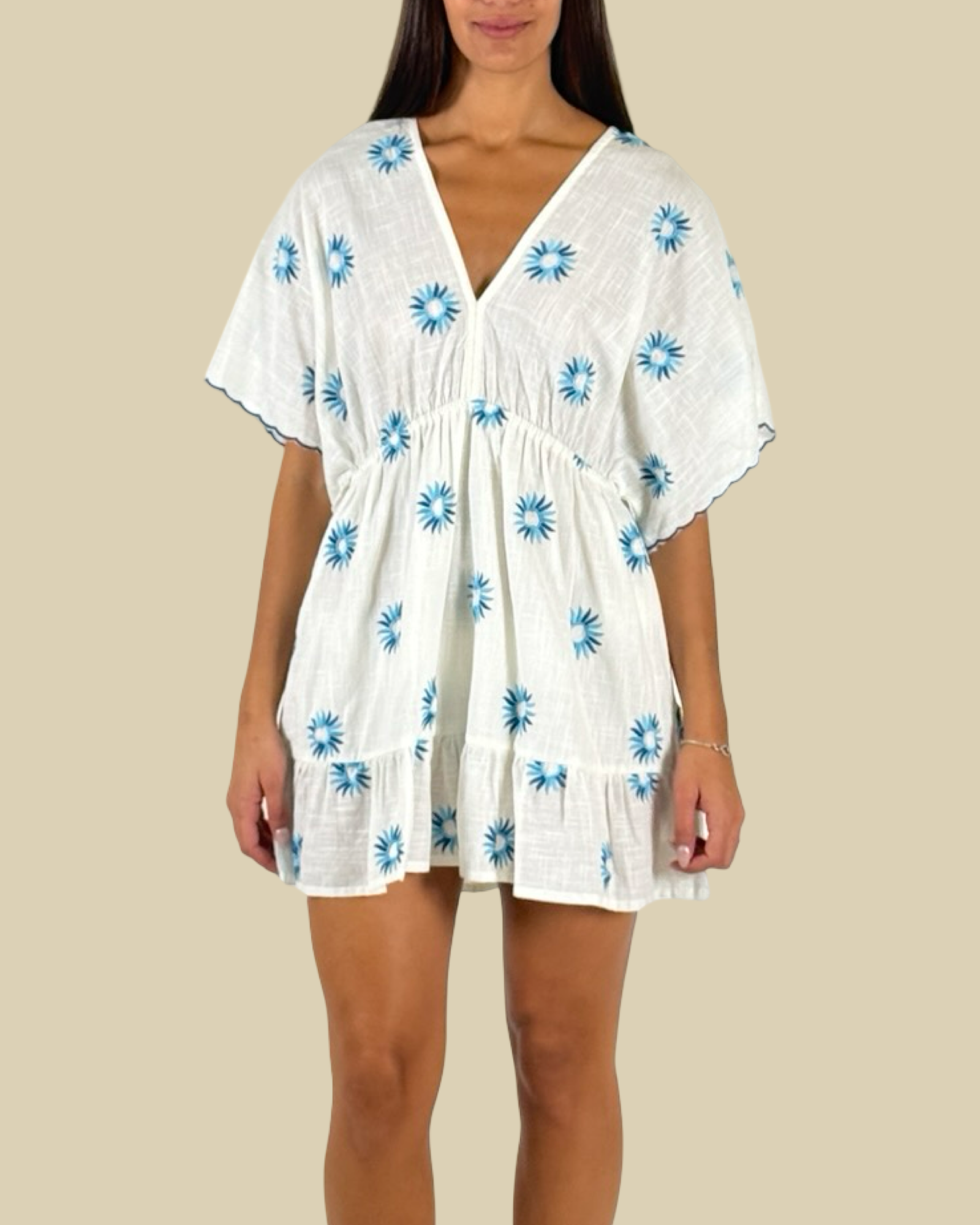 Light, playful, and effortlessly feminine, the Marisol Mini Dress is designed for carefree summer moments. With its relaxed fit, flutter sleeves, and delicate embroidered sun motifs, this breezy silhouette moves beautifully from beachside afternoons to sunset cocktails.