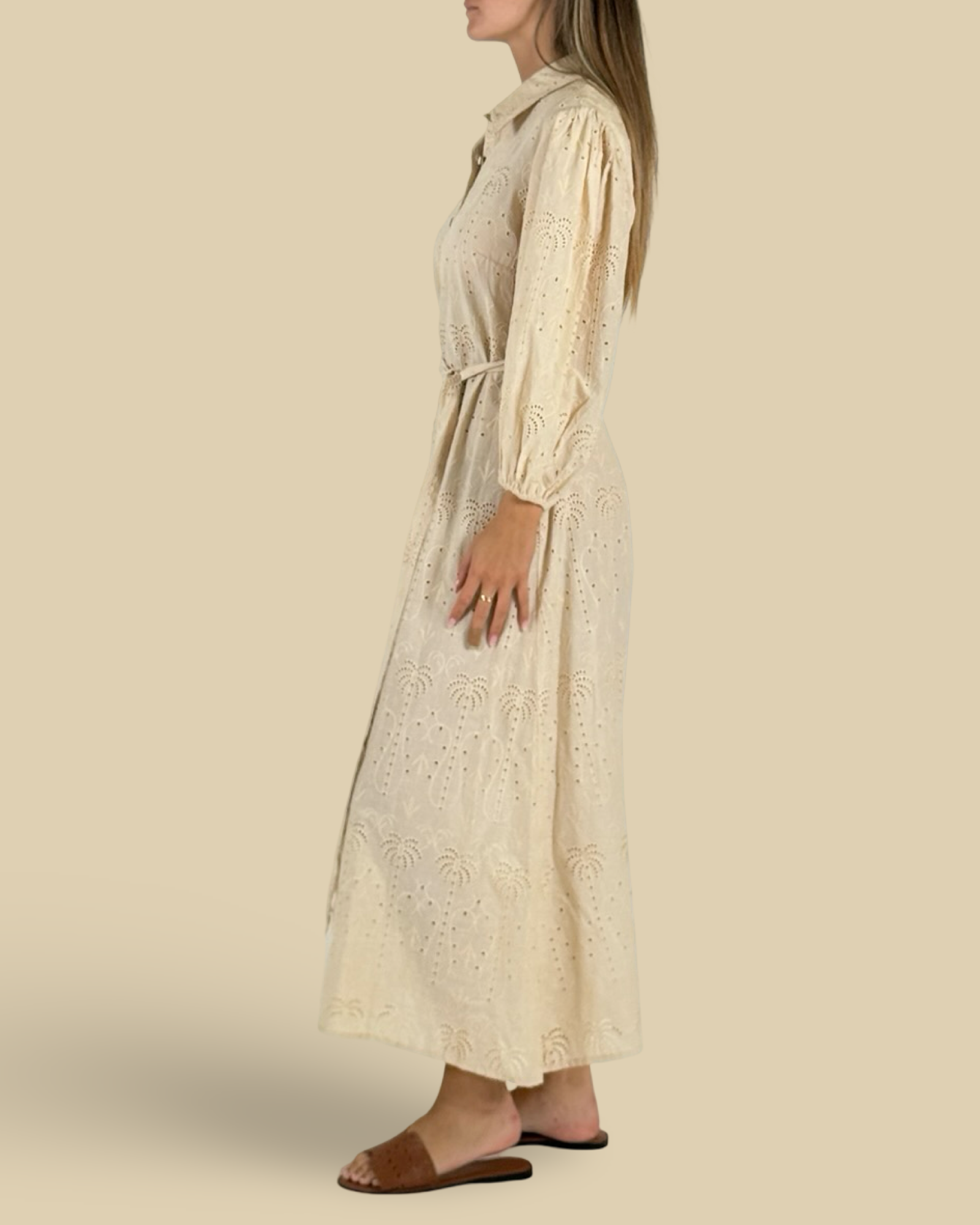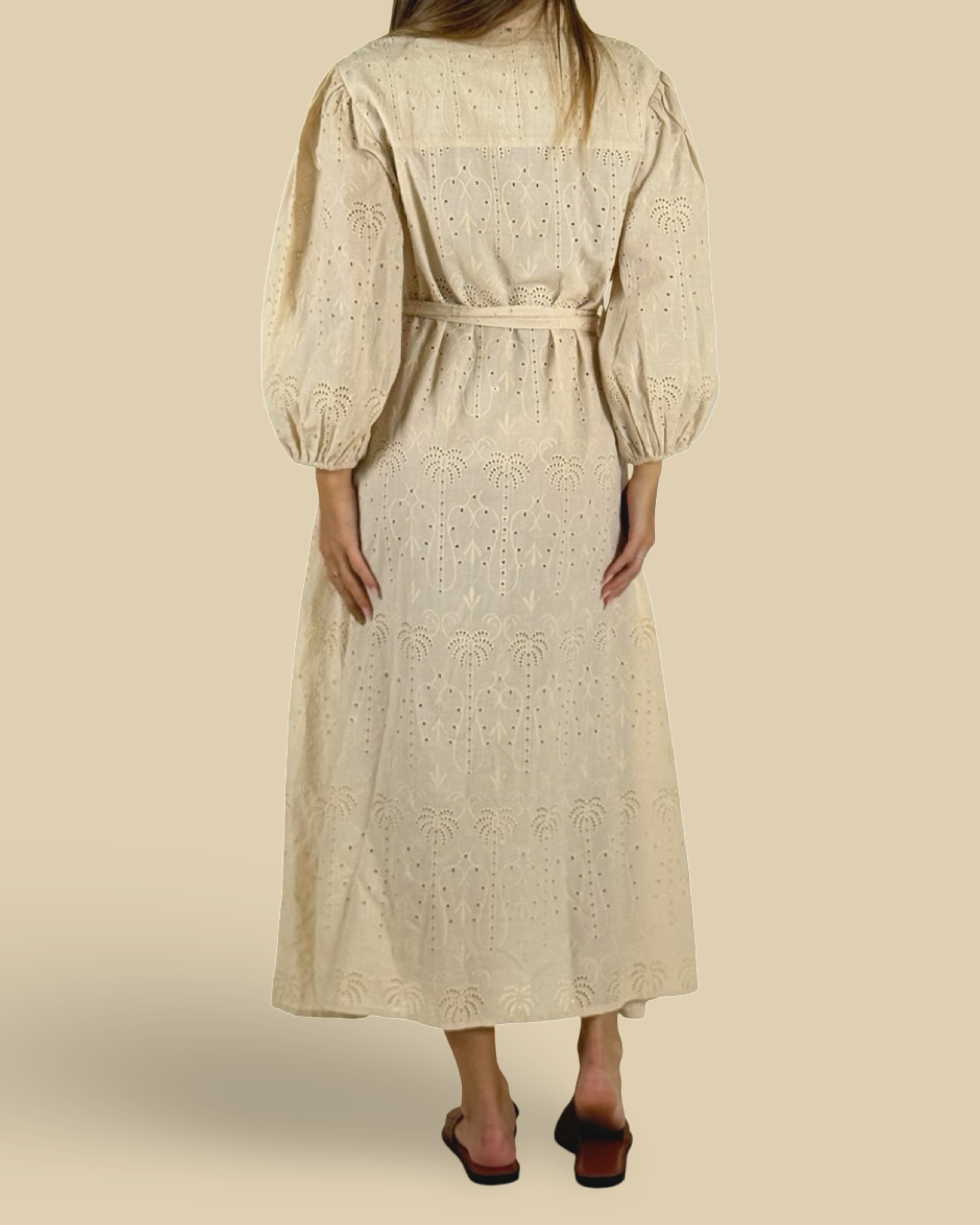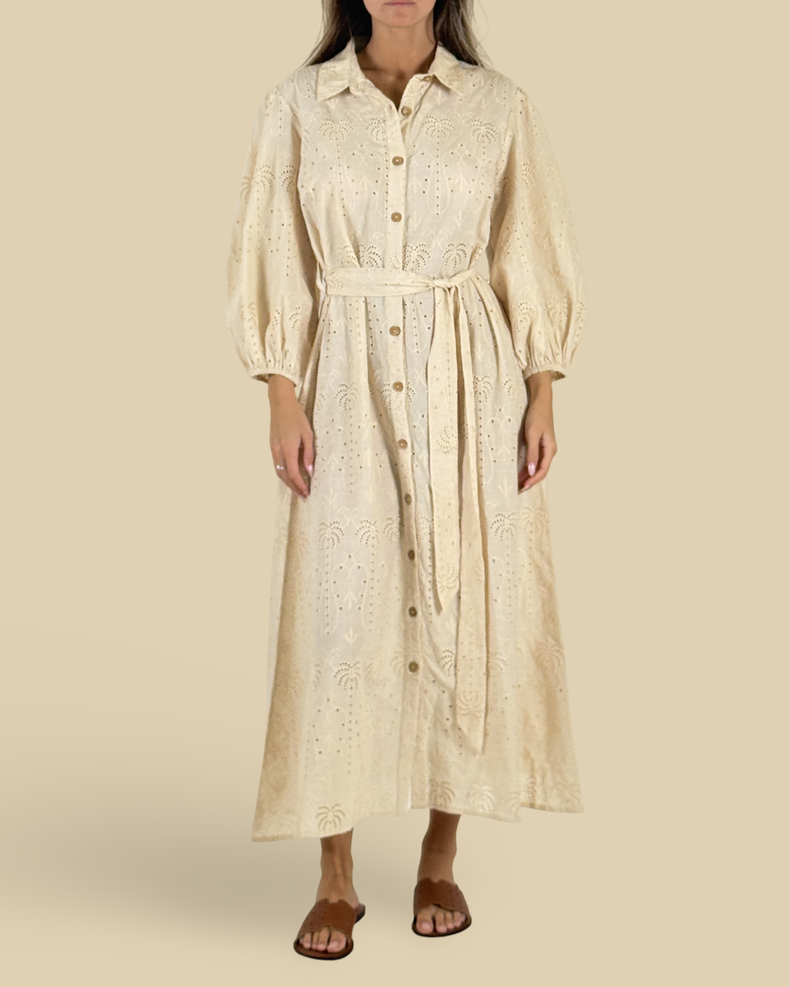 An effortless statement in soft sand-toned eyelet. The Palmina Maxi Dress features a button-front silhouette, gentle volume sleeves, and a removable waist tie to define the shape. Lightweight, breathable, and endlessly versatile. Wear it belted for structure or loose for easy coastal elegance.