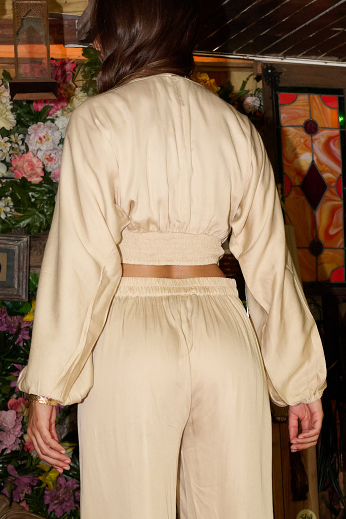 A dreamy wrap silhouette with billowy sleeves and shimmering shoulder embellishments. The Honey Top pairs effortlessly with its matching pants or denim for a laid-back yet radiant boho vibe.